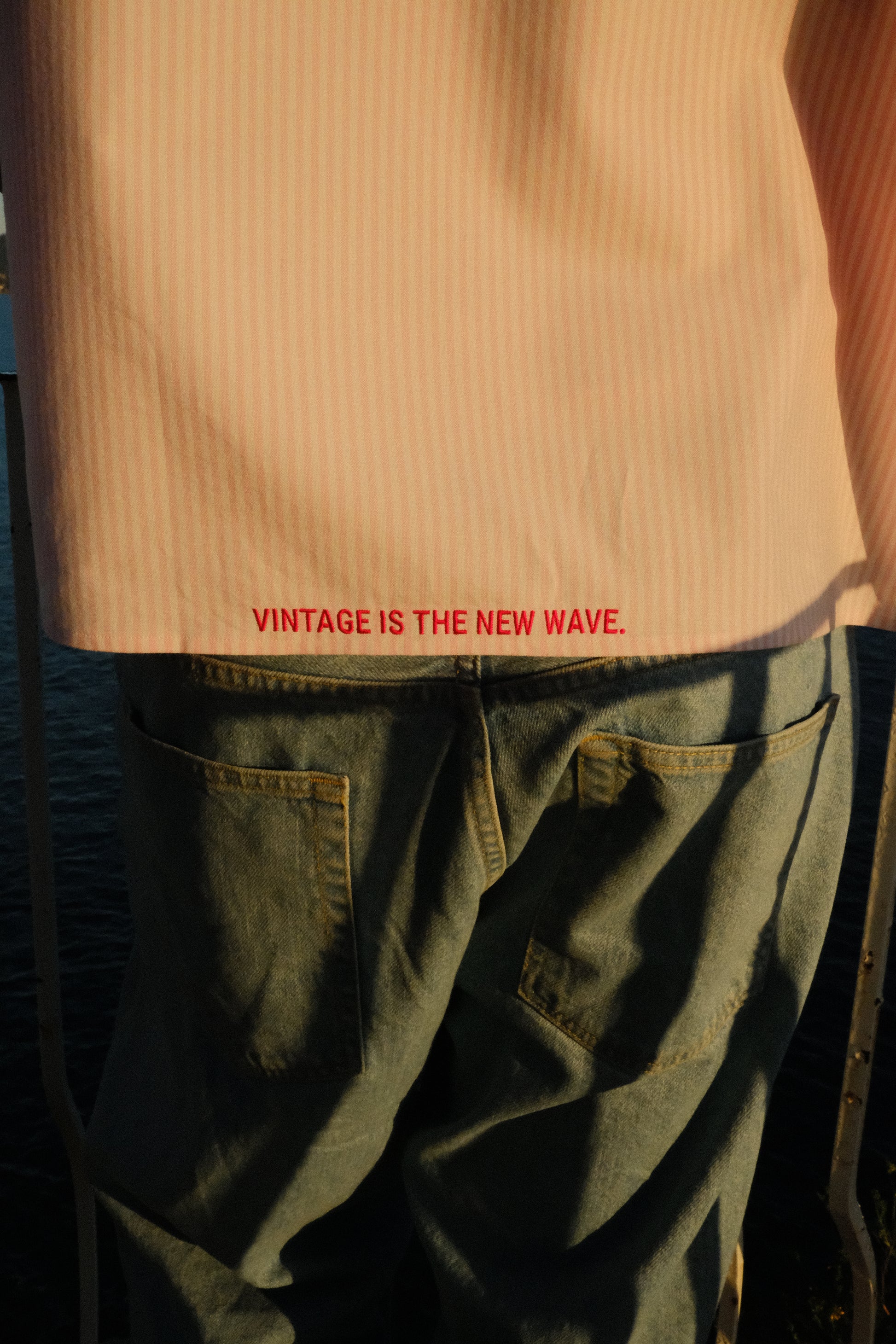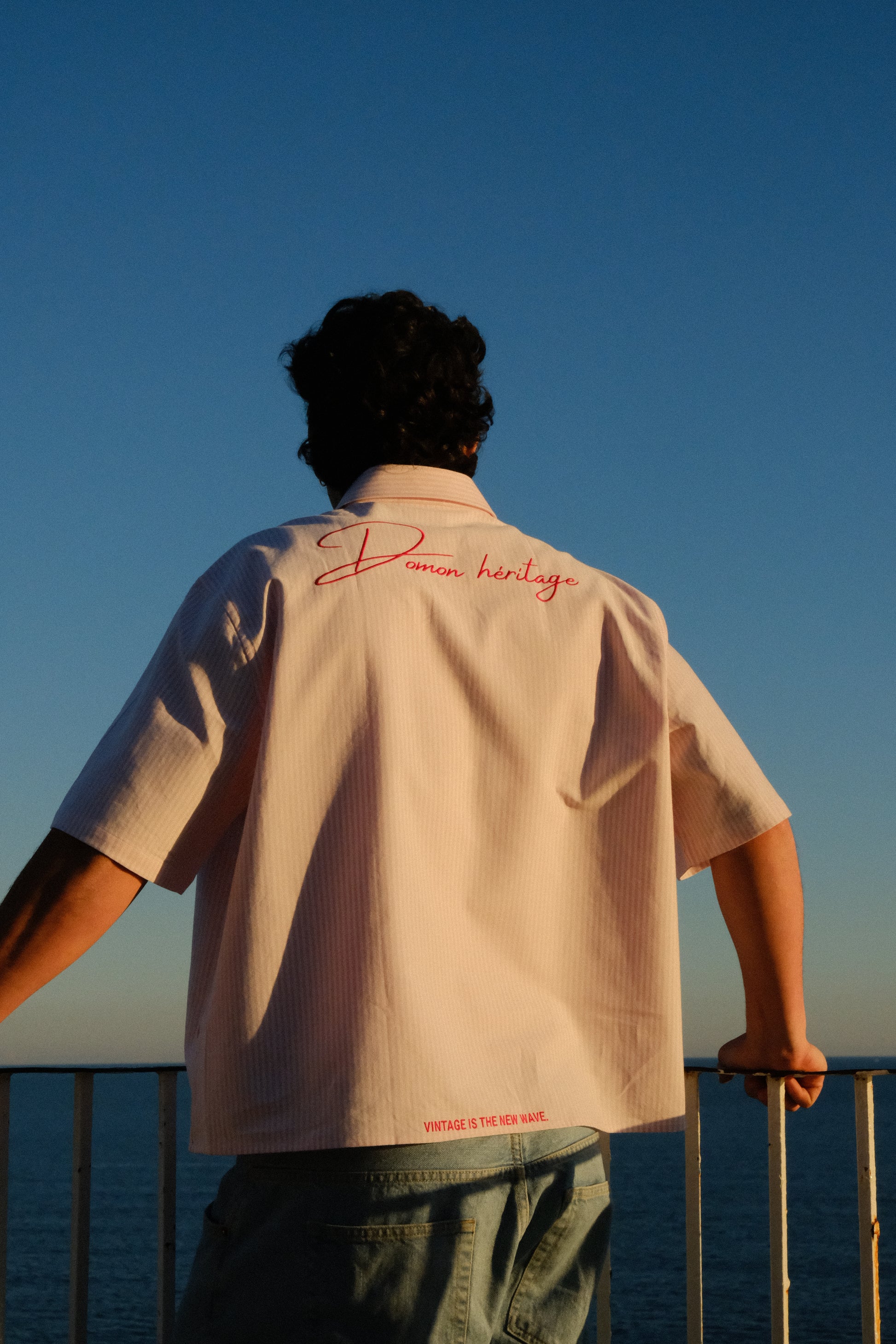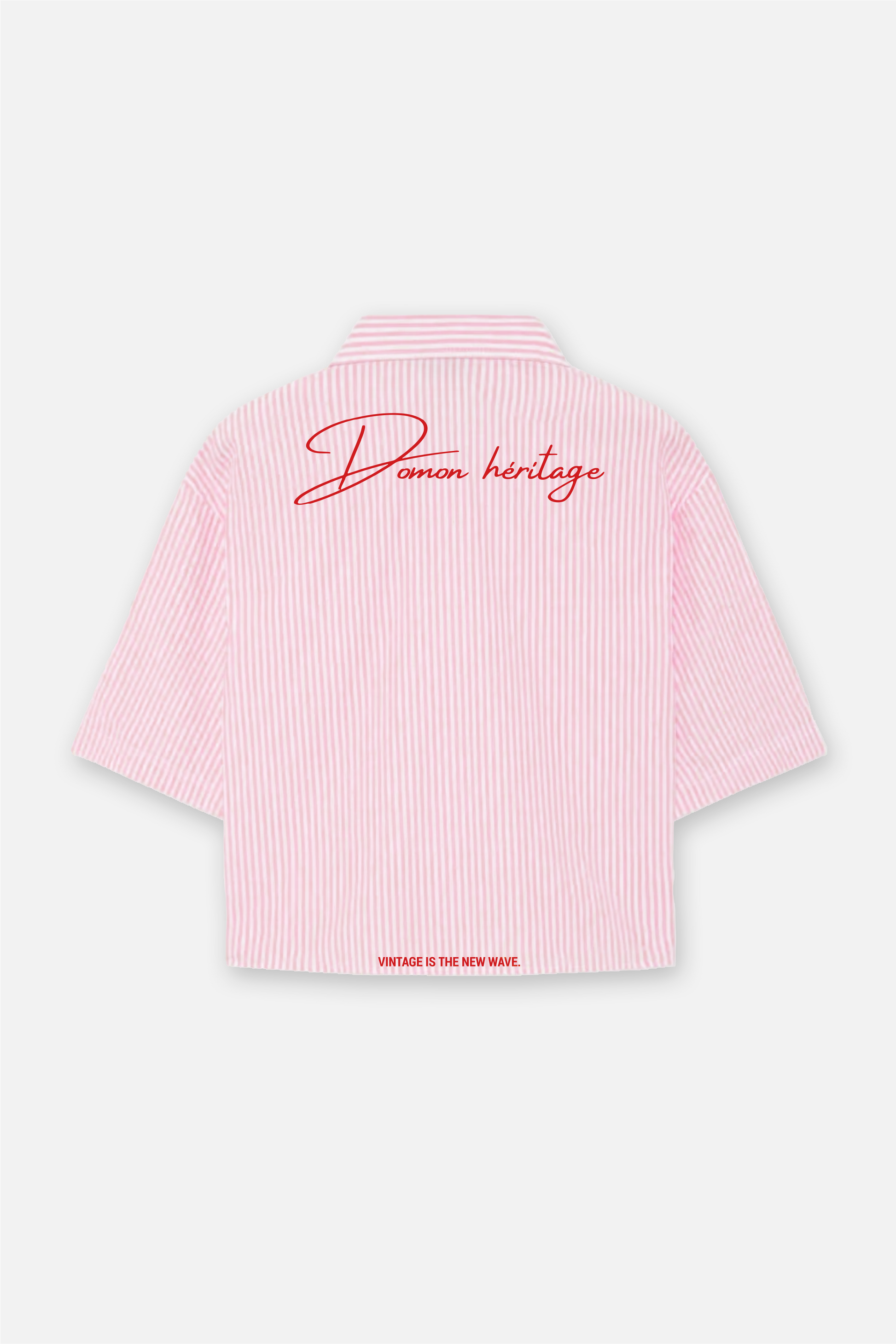 Voici la chemise Mariposa Rose, confectionnée en 100% coton avec un motif rayé rose et blanc. Son design mêle élégance et nostalgie, avec un papillon brodé sur le cœur, clin d’œil à son nom. Au dos, une broderie Domon Héritages’étire d’une épaule à l’autre, tandis qu’une discrète inscription « Vintage is the new wave » apporte une touche intemporelle. Une pièce pensée pour ceux qui cultivent un style raffiné.