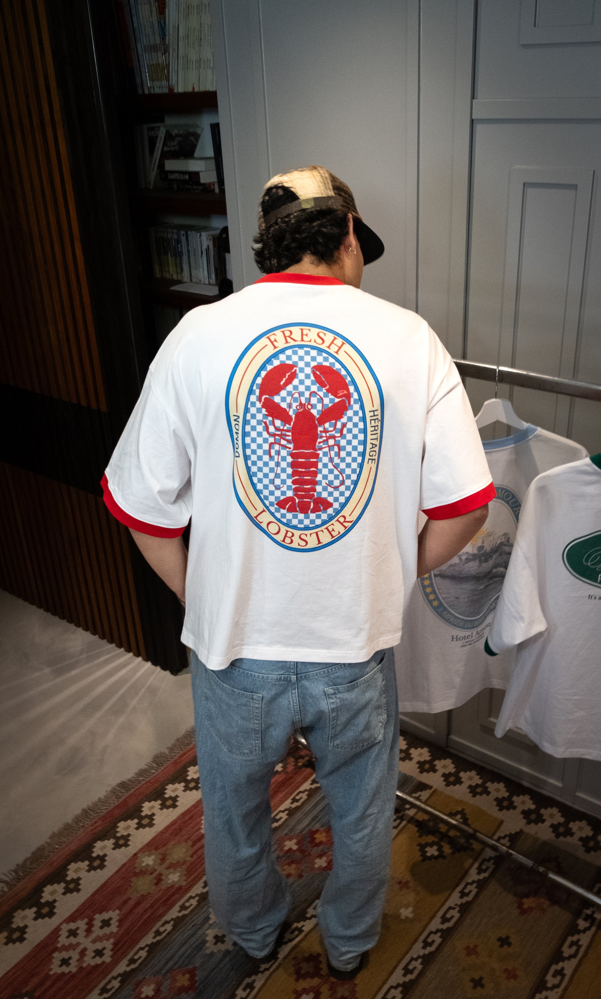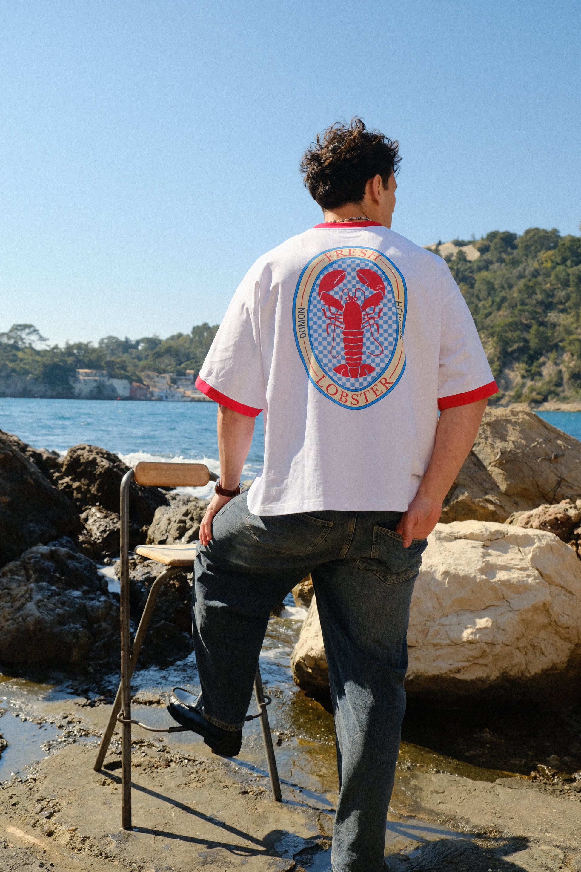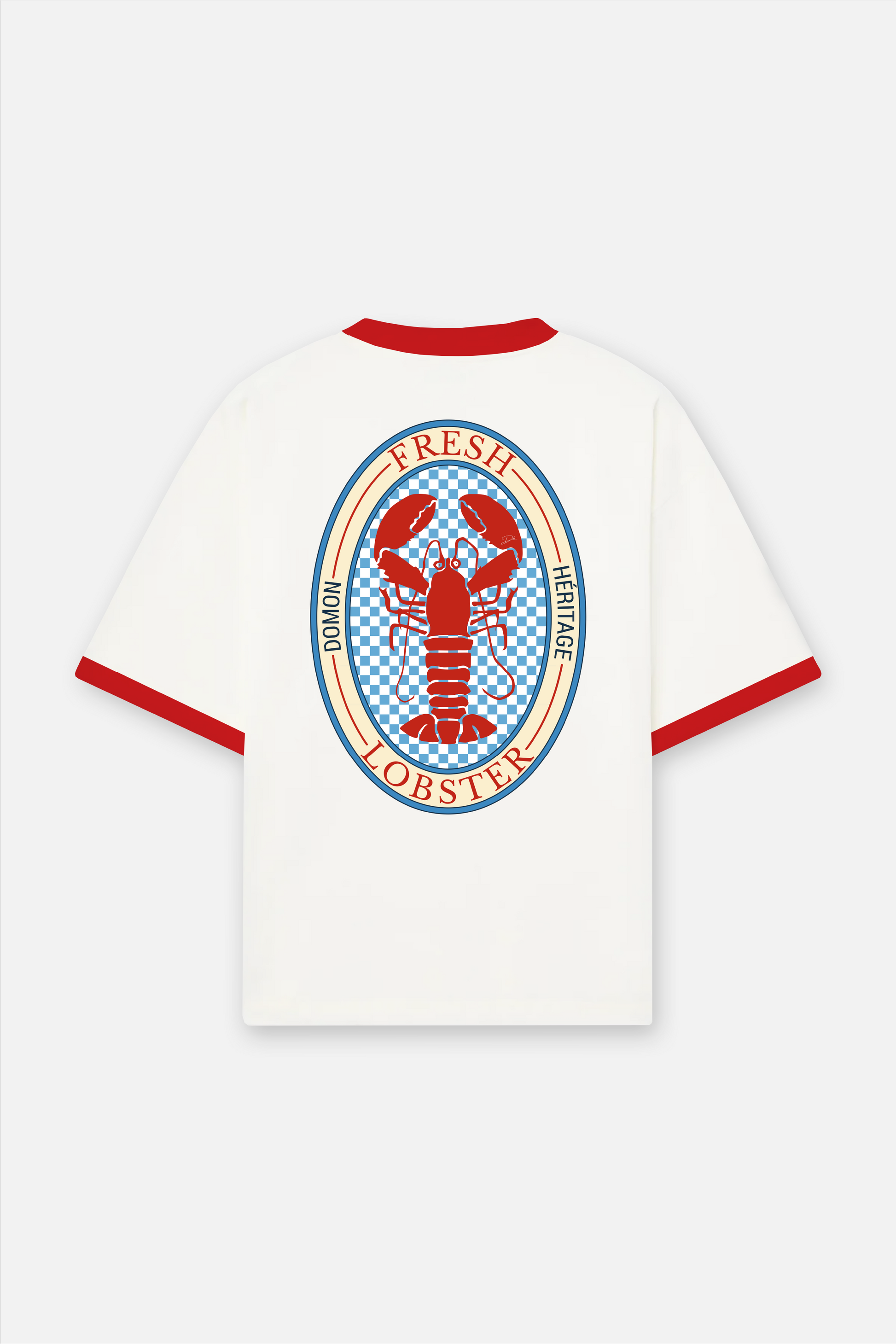 Voici le t-shirt « lobster », fabriqué en 100% coton 250gsm. Son design s’inspire des repas d’été autour de fruits de mer, avec un homard détaillé sur un fond à damier bleu et blanc. Le marquage « Domon Héritage » et le logo Retro Club apportent une touche rétro affirmée, faisant de cette pièce un incontournable de l’été.