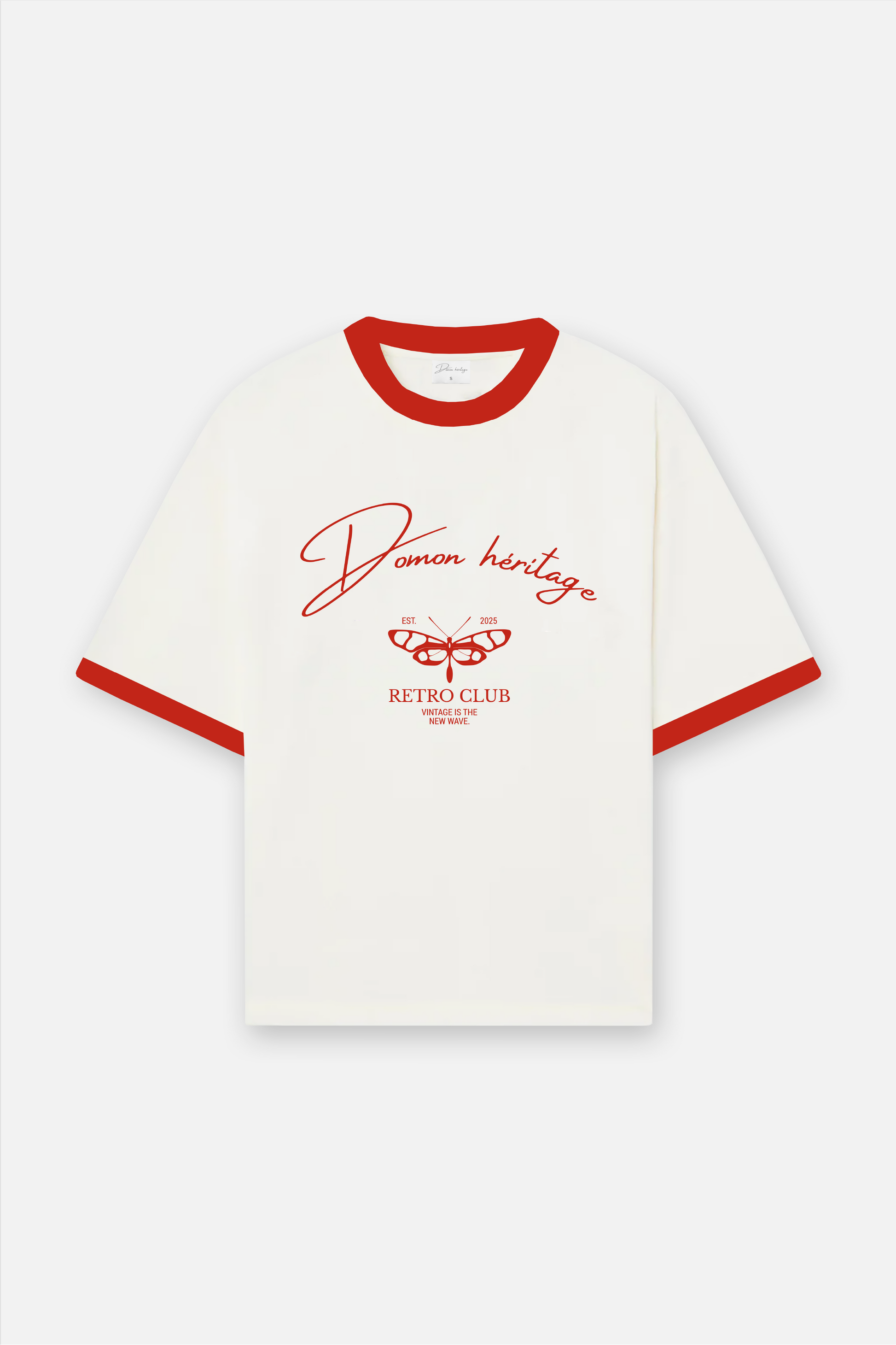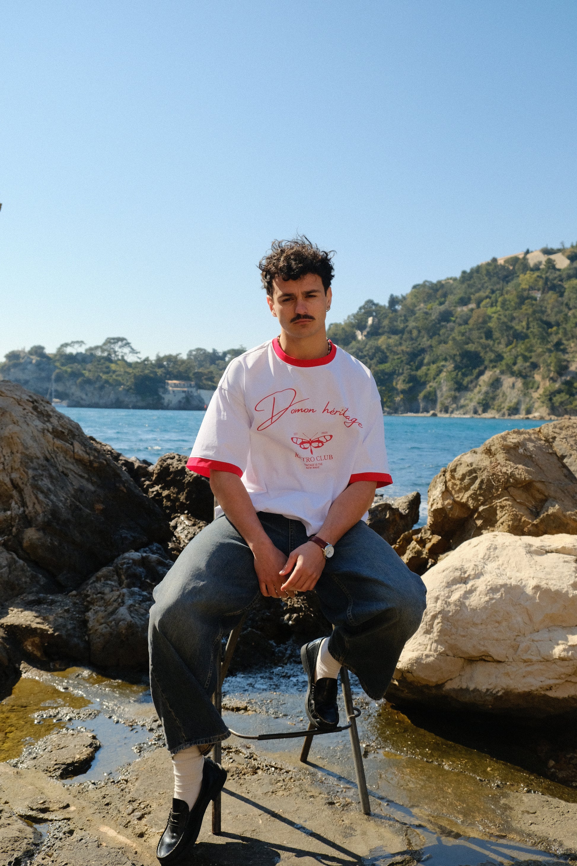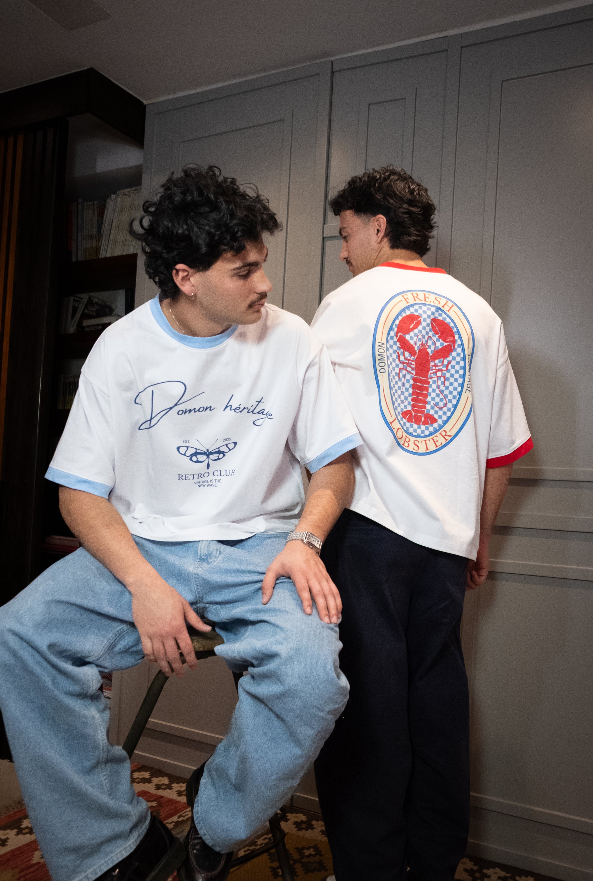 Voici le t-shirt « lobster », fabriqué en 100% coton 250gsm. Son design s’inspire des repas d’été autour de fruits de mer, avec un homard détaillé sur un fond à damier bleu et blanc. Le marquage « Domon Héritage » et le logo Retro Club apportent une touche rétro affirmée, faisant de cette pièce un incontournable de l’été.